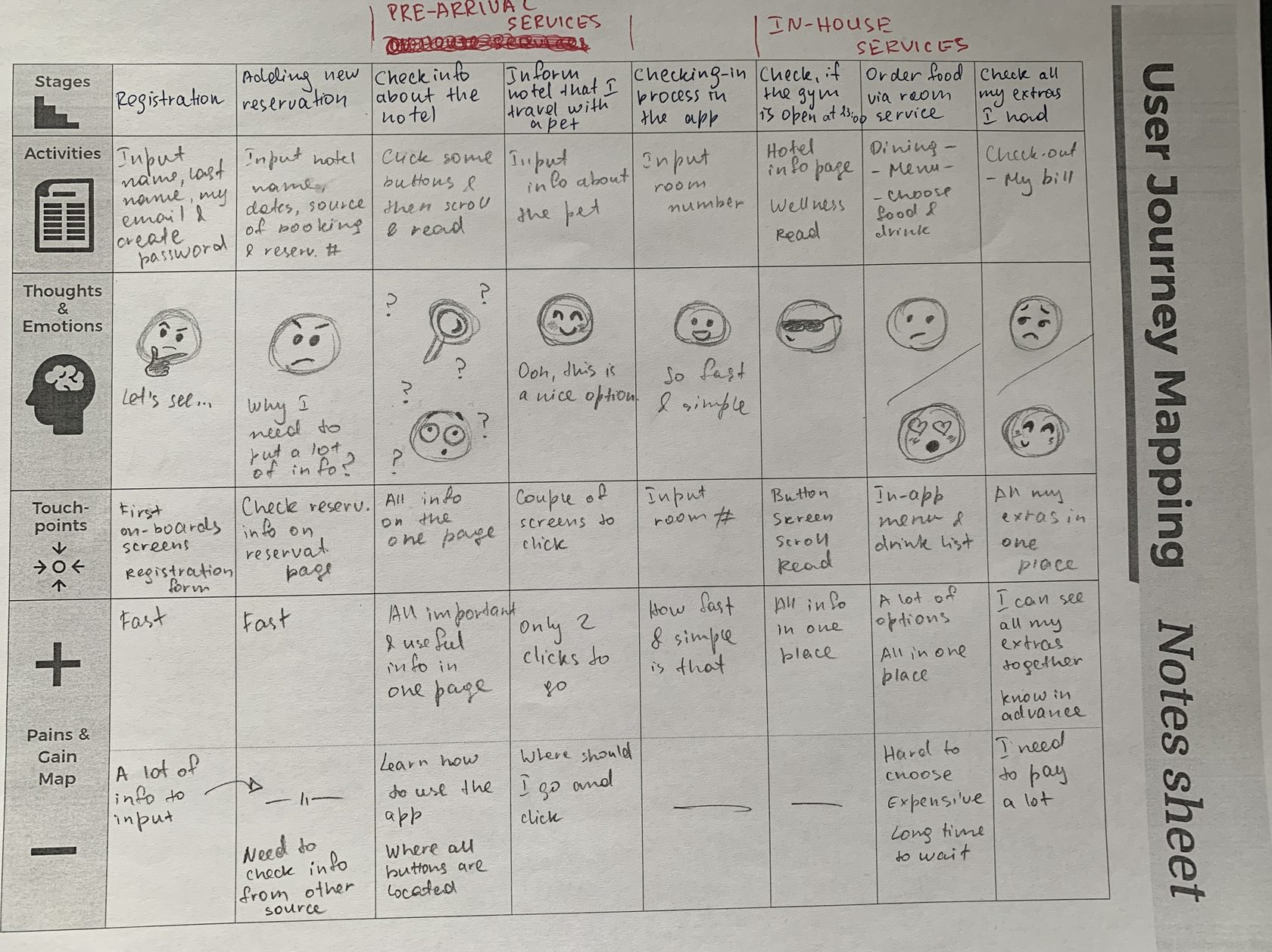 The user research started with defining our potential users - who they are, where they're from, why they travel, how often do they travel. We also had a look at their hotel inquiries - what preferences in terms of hotel rooms, food, services they have, what services they use, what they face the most. Luckily, since me and my friend are working in hotels, it was easy, but a bit timely, to conduct all the necessary data.